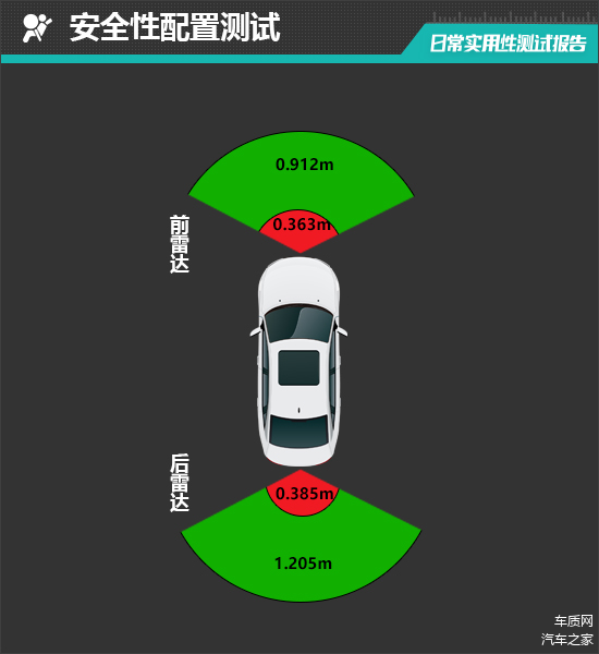 前驻车雷达最远可在0.912m处感应到前方物体,雷达功率表现一般。持续蜂鸣阶段提示距离为0.363m,同样未达到同级别车型测试均值。