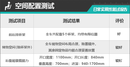 对于车内使用空间的测试,只针对前排触手可及的空间,不包括手套箱、中央扶手箱等需开启的空间。测试方法是将以下固定物品全部放置在前排的各个储物空间内,通过固定物品的放置情况来判断车辆储物空间的表现。测试选定的固定物品为:2瓶常规大小的矿泉水、1部大屏手机、1支口红、1个挎包、1副墨镜、1把折叠雨伞以及1包常规尺寸的抽纸。