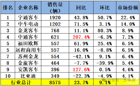 在销量后五位的企业中,安凯客车、比亚迪表现同样抢眼。其中,安凯客车增幅翻倍,展现出强劲的增长潜力,数据显示,安凯客车11月新能源客车销量为396辆(以47辆的销量优势跃升行业第九),同比增长127.6%,环比增长0.5%,市场份额为4.6%;比亚迪以349辆的销量成绩杀入行业前十,其市场份额为4.1%。