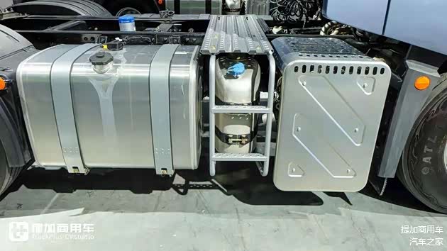 底盘右侧依次布置尾气后处理系统、尿素罐、柴油箱,布局紧凑合理