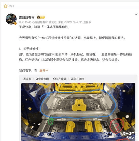魏建军此番言论一出,迅速引发关注。理想汽车材料技术负责人“吉超超有材”随即在社交平台发表不同看法。他以理想i8为例,详细解释了一体化压铸在碰撞工况下的表现。在正面和尾部碰撞时,一体式压铸结构并非处于碰撞第一线,至少有三层保护设计,包括防撞梁、吸能盒和纵梁,它们依次吸收能量,抵抗变形。一般低速碰撞最多损伤防撞梁,可直接更换;碰撞能量较高时,损伤吸能盒和纵梁也能整体更换,维修经济性较好,不存在“轻轻一碰、马上换车”的情况。他还介绍了一体化压铸的优势,如车身更轻质,可提升续航和能耗;更集成,生产效率高;有利于提升车身刚度,进而提升操控性和舒适性。同时,他也承认一体化压铸存在零件成本高、模具开发周期长、工艺质量控制难、严重碰撞时维修比钣金困难等劣势,但认为国内不用一体压铸主要原因是成本,而非维修性。