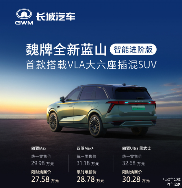 12月22日,魏牌全新蓝山智能进阶版上市。新车共推出3款车型,正式售价29.98-32.68万元,限时焕新价27.58万元起。