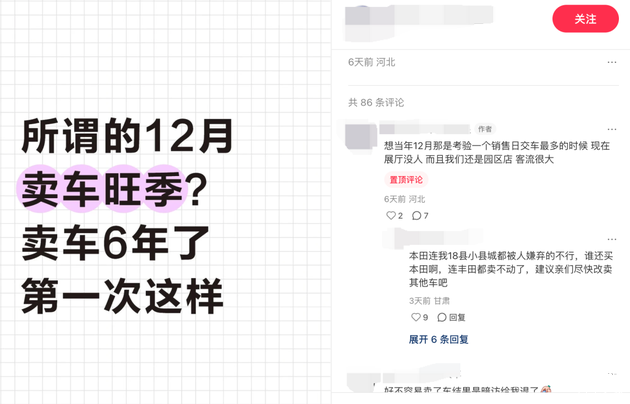 一位账号 ID 关键字是「石家庄」「广汽本田」的用户表示,「想当年 12 月是一个考验销售日交车最多的时候,现在展厅没人。」