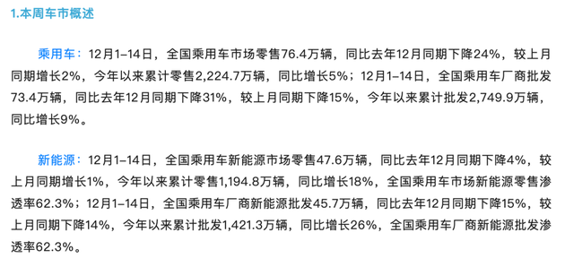 乘联会数据显示,12 月 1~14 日这两周,国内乘用车的销量同比下降达到惊人的 24%;单就新能源这一品类,也有 4% 的同比下滑。