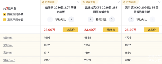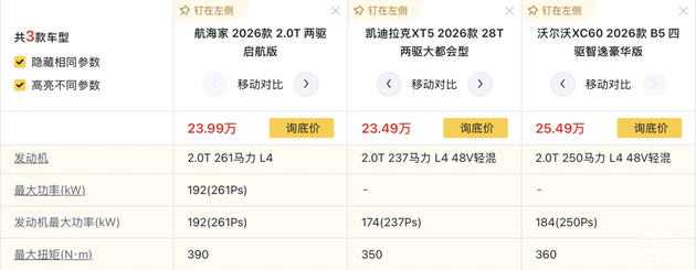 如果你的主要用车场景是城市通勤,那航海家启航版绝对够你满意。它搭载的 2.0T + 8AT 黄金动力组合,拥有 258 匹马力,在同级豪华 SUV 里属于动力储备相当充裕的那一档。对比 XC60 智逸豪华版和 XT5 大都会型,两者在动力参数和调校取向上都更偏“够用”,而航海家的动力响应更从容,起步不窜、加速不急,超车时却始终留有余量,日常开起来非常轻松。