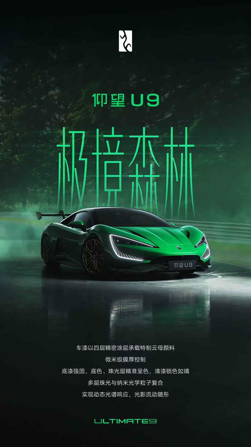 #仰望U9# 新添一个名为极静森林的外观配色,顾名思义这是为了致敬先前仰望U9 Xtreme在纽博格林北环做的单圈纪录——毕竟,纽博格林给人最深的色彩印象就是这种浓绿。 工艺上,“极静森林”方案的车漆使用四层精密涂层承载特制云母颜料,并且设计了多层珠光与纳米光学粒子复合的结构,以更好展现珠光漆的效果。大伙儿觉得它的表现力怎么样😎 #新能源汽车#