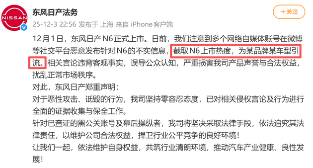 这一现象直接引发了东风日产法务部的关注,后者不仅公开了疑似荣威M7 DMH水军的评论截图,还发文谴责“多个网络自媒体账号在微博等社交平台,恶意发布针对日产N6的不实信息,借日产N6上市热度为某品牌车型引流”。