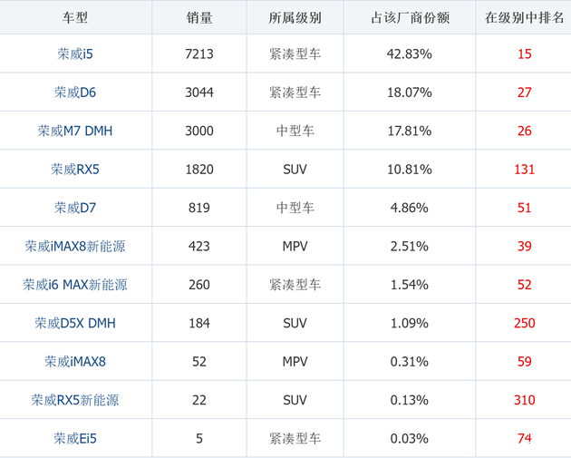 从销量数据来看,今年11月荣威累计销量突破1.6万辆,但其中近半数销量由主打性价比的荣威i5贡献。除了这款走量车型外,月销能突破3000辆的仅有荣威D6、荣威M7 DMH两款,其余如荣威D8、荣威iMAX8新能源、荣威i6 MAX新能源等一众车型,月销量仅停留在几十台到几百台的区间,产品矩阵的表现严重失衡。