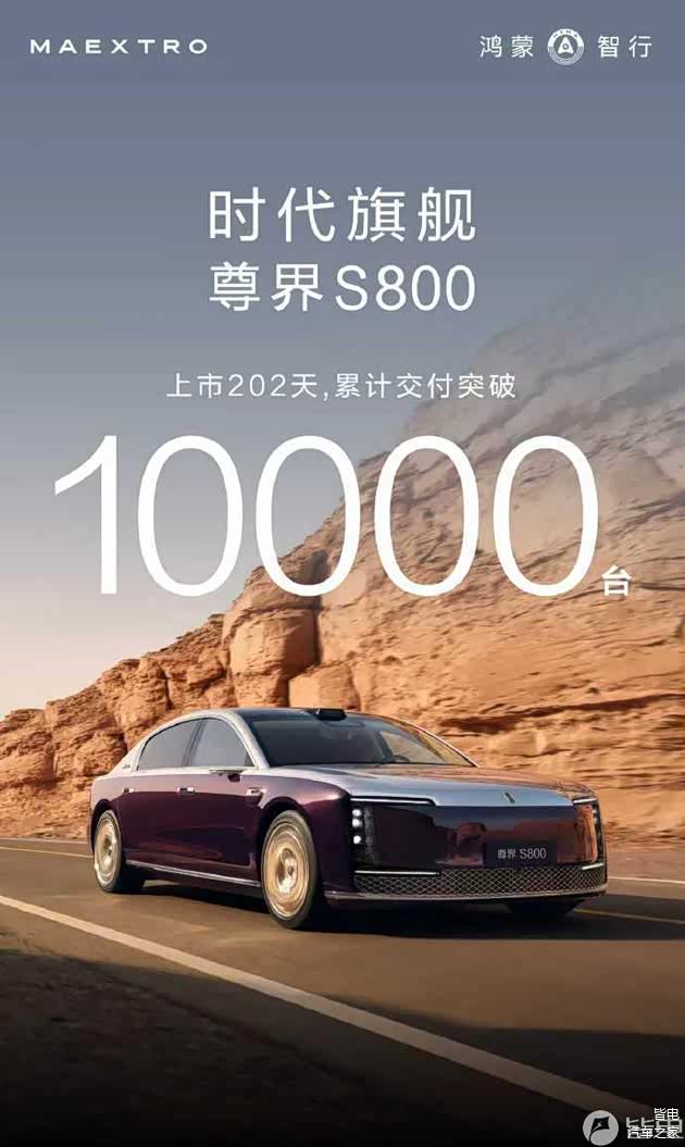 12月23日,鸿蒙智行官方获悉,江淮与华为联合打造的超豪华旗舰轿车 尊界S800创下行业新纪录,自2025年5月30日上市至12月16日,仅用202天便实现累计交付破万台,成为中国百万级豪车中最快达成该里程碑的车型。该车11月单月交付量达2205台,连续三个月蝉联70万元以上豪华车细分市场销冠。