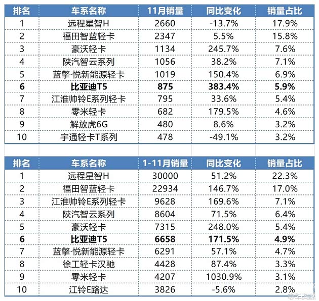 从11月装车量的细分车型分布来看,新能源物流车市场格局呈现显著集中化特征: