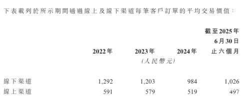 招股书中还披露了线上及线下渠道每笔客户订单的平均交易价值。报告期内,线下渠道分别为1292元、1203元、984元和1026元,线上渠道分别为591元、579元、519元和497元,均较初期水平有所下滑。