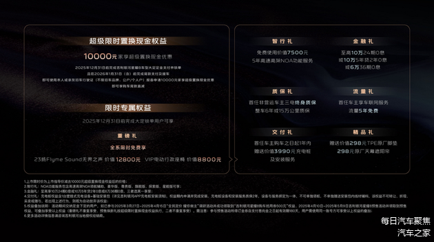 最后,我们必须回到那个震撼市场的起点:价格。吉利银河星耀8的指导价从11.58万元起。在此价格基础上,截至12月31日,用户还能享受到包括首任车主三电终身质保、5年高速NOA功能免费使用、免费升级价值1.5万元的23扬声器音响及VIP行政座椅套装在内的限时权益。同时,至高8万24期0息金融方案、首年赠送充电桩及安装服务等政策,大幅降低了拥有门槛。