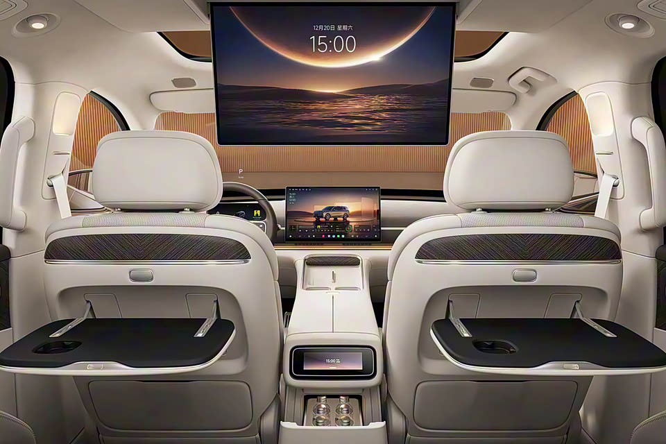 来到后排首先能看到零跑D19配备了一块大尺寸吸顶娱乐屏,两个小桌板设计满足不同用户的需要,中岛区域还带有触控屏以及冷暖冰箱。后排车门提供有手动遮阳帘,并且能看到零跑D19的后排门板同样都是采用了向下延伸的扶手设计,能给后排乘客带来更加宽敞的视觉效果。