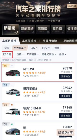 在中大型插混轿车领域,风云A9L的表现已印证这一势头。该车型7月上市即获纯中大轿车榜第三,仅比当月亚军比亚迪汉少67辆;8-11月四个月内三次登顶,仅9月以11辆之差屈居第二。