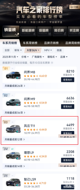 此前稳定近一年的“问界M8、M9+理想L9”前三格局被打破,刚于10月30日上市的奇瑞 风云T11,首月便以亮眼销量超越理想L9,跻身该细分市场月度销量第三,成为今年车市最受关注的“黑马”车型。