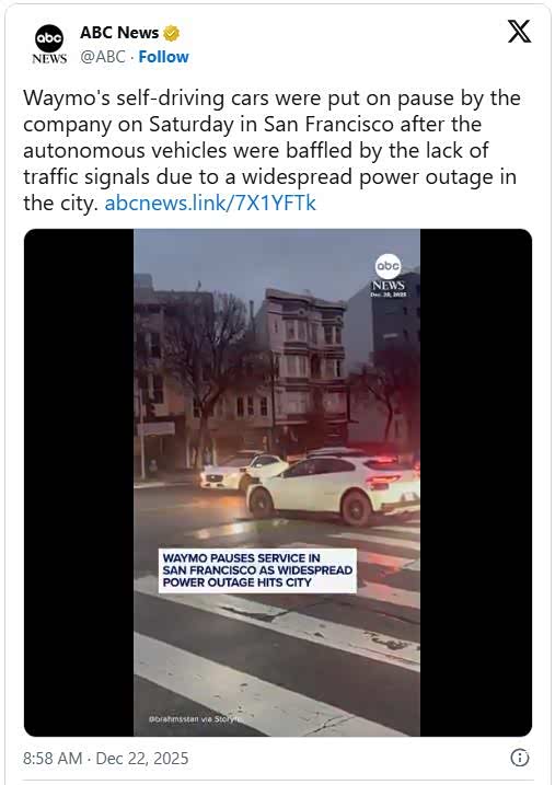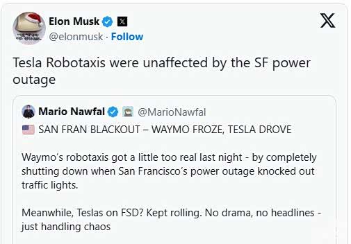 与此同时,特斯拉首席执行官埃隆・马斯克得意表示:“特斯拉的自动驾驶出租车在此次停电事故中全程未出现任何问题。”
