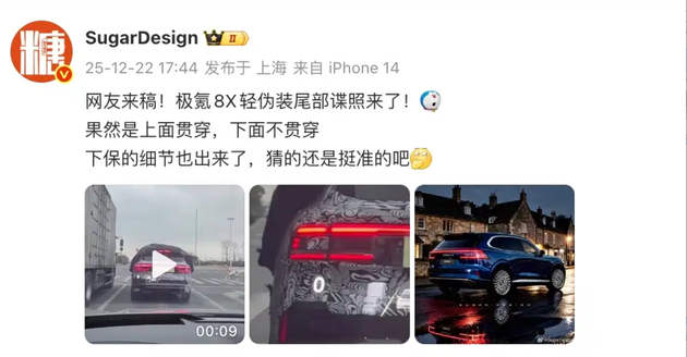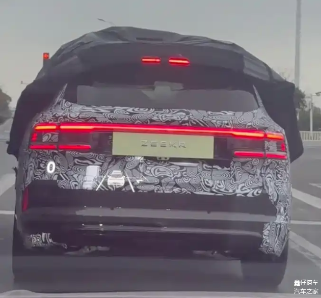 车尾部分,极氪9S继续使用了9X的门型尾灯结构,这是极氪在旗舰SUV上的核心视觉符号。但在具体造型上,9S并未简单复用9X的灯组设计。从曝光图片来看,9S尾灯整体更为狭长,灯腔内部结构趋于简化,线条表达更直接。门型轮廓依旧存在,但不再追求复杂层次,而是通过灯带比例和横向延展,强化车辆的宽体视觉效果。这种设计方式对于一台定位偏运动的中大型SUV而言,既保持了家族辨识度,也避免了尾部造型过于厚重,对整车重心视觉有一定下压作用。