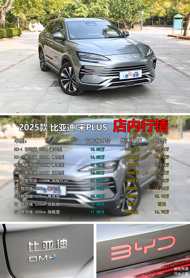 《郝车来袭》原创导购:近日,郝哥了解到,比亚迪宋PLUS或将停产,自此在海洋网售卖的唯一的王朝车型也将退出历史舞台,或许为了清库存,又或许为了抢占新能源免购置税市场的最后冲刺,总之目前新车已拥有十分可观的优惠力度。具体来说,2025款宋PLUS共分为五款DM-i混动和四款EV纯电共计九款车型,售价区间为13.58万~18.08万元。不过,根据郝哥暗访北京地区某比亚迪4S店得知,DM-i全系优惠14000元,EV版本则除顶配以外全系直降8000元,那么最终该选择哪款配置才最划算呢?最终落地价得多少钱?养车成本又如何呢?