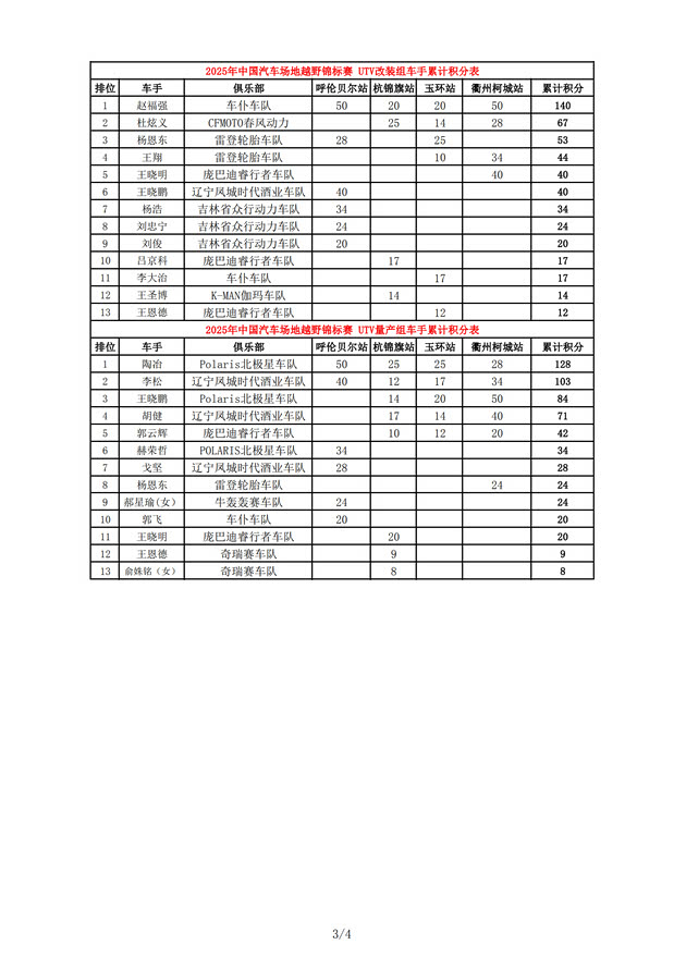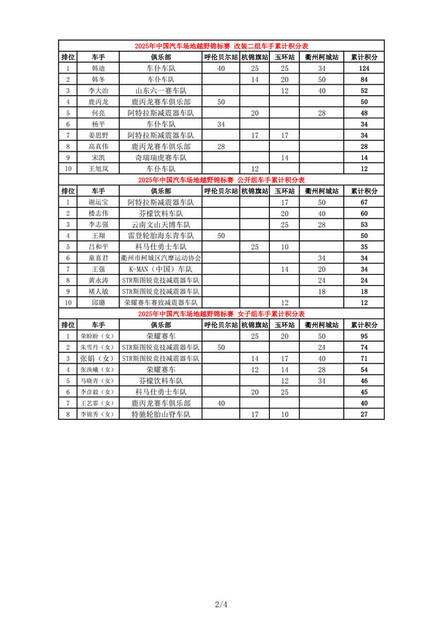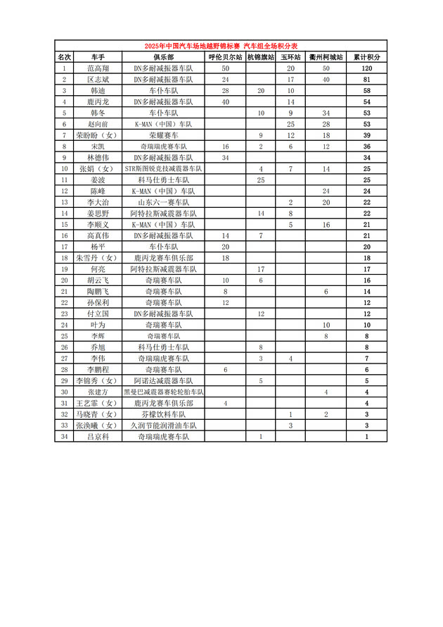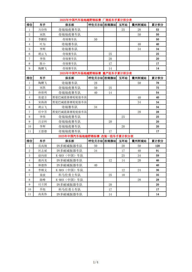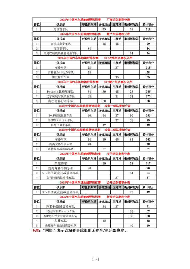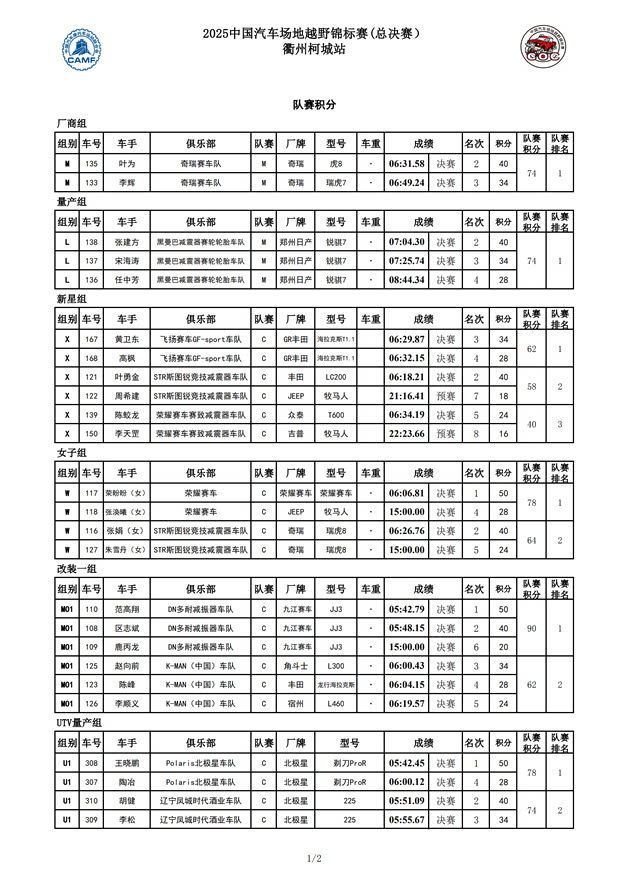 2025COC中国汽车场地越野锦标赛年度总成绩及各车队、分组成绩
