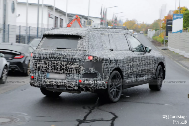 来到车尾,最抢眼的莫过于那“占位符”一般的测试用小尾灯了,不过往下看还是能发现一些端倪的。下扩散器两边那夸张的双边双出排气造型、目测起码有21英寸的多辐条大轮圈以及前轮内被涂黑了的M“大鲍鱼”,无一不在暗示这可能是采用了轻混V8动力单元的M Performance版车型(X7 M60i)。既然提到动力单元,新车除了继续保留汽油的B58、N63、S68以及多款柴油发动机之外,还将有可能加入BEV版车型iX7,但是有消息透露iX7将会打破常规继续使用升级版CLAR平台打造,与旗下的新款“小弟”车型汽油版用CLAR平台造换Neue Klasse设计语言、BEV用Neue Klasse大全套完全不同,在旗舰F级车型X7上汽油版和BEV版都将继续使用CLAR平台。看来BMW自己也不看好iX7能卖多少啊,根本没让BEV的Neue Klasse平台专门做适配,玩起了国内的3系CLAR平台魔改“特供”iX3 Sedan的那套了。