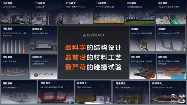 材料工艺的升级,为安全性能提供了硬件保障。银河M9整车高强度钢占比达81.2%,1000MPa以上高强度材料应用比例达40.4%,这一数据在同级车型中表现亮眼。同时,车辆在关键部位布局8处2000MPa热成型钢,这种材料强度较高,能在实现轻量化的同时,大幅提升乘员舱的抗冲击能力。此外,车型搭载行业首发的军工级CFC复合材料座椅横梁、全球首发1470 DP超级高强钢等尖端材料,既优化了车身刚性与吸能效率,又实现了“安全与轻量化”的平衡,避免了单纯堆砌高强度钢导致的油耗、操控方面的妥协。