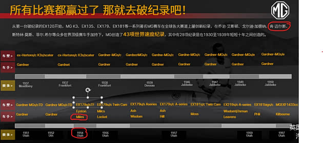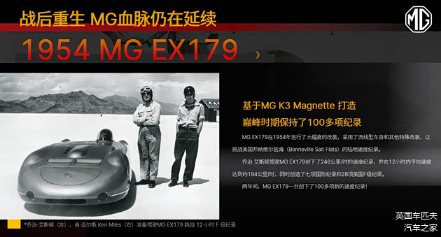 在这里,迈尔斯把对机械的理解发挥到极致:1951 年驾驶 MG TD 敞篷跑车横扫美国跑车俱乐部赛事,亲手改装的 “飞瓦” 赛车在 SCCA Modified 级别赛场惊艳全场;1955 年跻身 MG 车队,驾驶 MG EX182 征战勒芒;1956 年更是驾驶升级后的 MG EX179,在邦纳维尔盐滩的烈日下创下 16 项国际 1500cc “E” 级纪录,10 英里时速 274 公里 / 时的成绩,至今仍是 MG 性能史上的高光时刻。