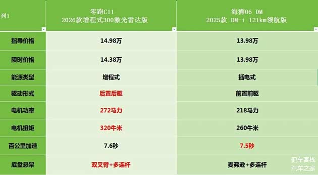 首先是动力,零跑C11搭载了一台后置后驱永磁同步电动机,电机功率为272马力,总扭矩为320牛米,动力在这个价位确实很有竞争力,而海狮06 DM呢?电机功率只有218马力,总扭矩为260牛米,还是前置前驱。至于底盘悬架,还是麦弗逊式独立悬架加多连杆式独立悬架的组合,当然,得益于比亚迪的云辇系统,这车的驾驶质感很不错,尤其是过弯的时候,侧倾抑制做的很不错,起步不抬头、刹车不点头,底盘很整、很扎实。