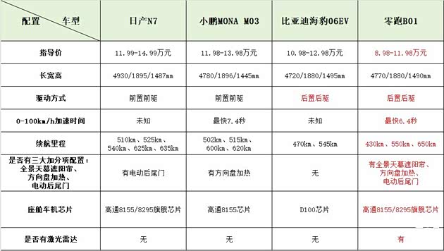 虽然都是10-15万可入手的车型,但放在一起对比就发现不同车型的价格差不算小。日产N7的指导价为11.99-14.99万元,小鹏MONA M03的指导价为11.98-13.98万元,比亚迪海豹06EV的指导价为10.98-12.98万元,零跑B01的指导价为8.98-11.98万元,可以看出唯一的一款合资车日产N7定价较贵,新势力热门车型零跑B01的定价相对亲民一些,是四款车中唯一起步价低于10万元的车型,顶配车型售价却与日产N7、小鹏MONA M03的入门车型售价相当。