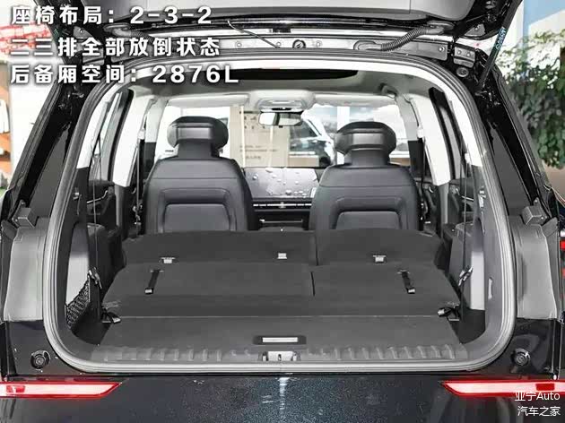 不止坐得舒服后备箱空间同样惊喜,在三排座椅全部启用的情况下,仍有309L的容积,能轻松放下3个20寸登机箱和一些随身行李,全家出游也不用担心车内空间不足;如果放倒第三排座椅,容积瞬间拓展至969L,过年回家装下父母的爱心年货绰绰有余;要是需要装载大件物品,2-3-2座椅布局可以将二排和三排座椅全部放倒,能形成2876L的超大纯平空间,露营装备、婴儿车甚至小型家电都能轻松容纳,空间灵活性堪称“移动的家庭仓库”。