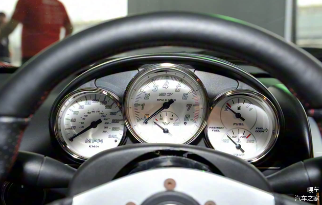 最左边是时速表,最高可以到390码,实际被限制在了 354公里/小时。赛麟S7用的是7.0升V8发动机,此发动机并不是赛麟自己生产的,而是福特的发动机,经过了强化。据工作人员说,它有1060马力,百公里加速仅需要2.4秒,比布加迪威航快了0.2秒。