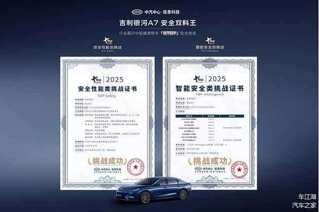 12月25日,吉利银河A7成功通过中汽中心行业首次中型插混轿车「双TOP」顶级安全挑战,成为行业唯一同时获颁安全性能类挑战证书和智能安全类挑战证书的的车型。安全家轿认准银河A7!凭借吉利汽车全域安全体系的最坚实底座,吉利银河成为了全球最快达成年销百万辆的新能源汽车品牌,作为银河品牌主打车型之一,吉利银河A7完整继承了吉利的安全基因,凭借7大核心安全实力,成功通过中汽中心安全大考,再次证明其作为十万级混动家轿安全新标杆的颠覆性实力。