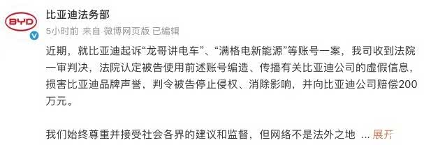 比亚迪法务部发文称,近期,就比亚迪起诉“龙哥讲电车”、“满格电新能源”等账号一案,公司收到法院一审判决。法院认定被告使用前述账号编造、传播有关比亚迪公司的虚假信息,损害比亚迪品牌声誉,判令被告停止侵权、消除影响,并向比亚迪公司赔偿200万元。