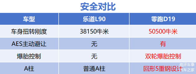 对比完三电,我们再来看看对于一辆汽车更为重要的安全素质。从公开资料上可查询的基础用料来看,乐道L90的车身扭转刚度为38150牛米,而零跑D19的车身扭转刚度为50500牛米,对比前者拥有非常大的提升。而且,在目前非常重要的主动安全功能上,零跑D19搭载了AES紧急避让功能,而这个功能乐道L90并未搭载。