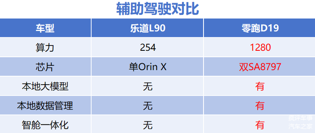 而在辅助驾驶能力上来看,乐道L90并没有搭载世界大模型。零跑D19则搭载了目前行业主流路线之一的VLA世界模型辅助驾驶系统,双8797芯片高达1280TOPS算力的加持下,让零跑的辅助驾驶能力,真正意义上的达到行业头部玩家的级别。可能大家也注意到了,我把智能化和辅助驾驶两个大系统放在一起来进行了对比,原因就是,在零跑的架构内,已经真正意义上的实现了,智能座舱和辅助驾驶系统的一体化中央域控。单就这一点来看,其他两个对比车型,甚至是目前行业内的大多数车型,都还没有实现这一能力。