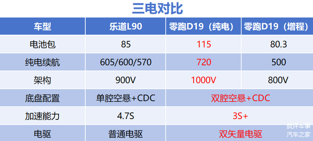 其次,在已知的三电数据上来看,纯电车型乐道L90搭载了全系900V架构。对比来看,纯电版本的零跑D19搭载了从电池、电驱到电控的全栈千伏高压体系,能量损耗更低、补能效率更高,输出能力也要更强一些。而增程版本的零跑D19则搭载了全栈800V的高压增程系统,快充区间的充电时间只需要15分钟。而作为新能源车型,在类似的价格区间内,能拥有比对手更大的电池包和更长的纯电续航以及更快的充电效率,这本身就应该算是新能源车型的核心优势之一了吧?更何况还有能彻底解决续航焦虑的增程版本,由此看来,做到了人无我有,人有我优的零跑D19,他所面对的潜在用户群体,就已经要比乐道L90更广阔一些了。