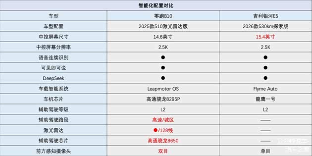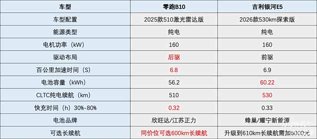 接着我们选择两款车型的中配车型,非常巧合的是,零跑B10的中配车型是2025款510激光雷达版,指导价11.98万,而吉利银河E5的中配车型是2026款530km探索版,指导价同样为11.98万,指导价一致,对比起来就更具有参考性,它们也是各自车系中,关注度很高的车型配置。但有一点值得注意,零跑B10目前终端给到了5000元的优惠,同时还有首任车主的整车终身质保和赠送充电桩权益,比起吉利银河E5还是要更实在一些。当然,价格/权益是一方面,产品力才是重头戏,接下来我们围绕三电系统、空间舒适、智能化配置两个非常重要产品点进行对比。
