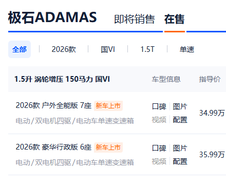 整体来看,极石ADAMAS 2026款定位清晰,兼顾豪华城市SUV与硬派越野车特性。双版本车型分别覆盖商务舒适需求用户与户外探索需求用户,感兴趣的朋友不妨亲自去驾乘体验。