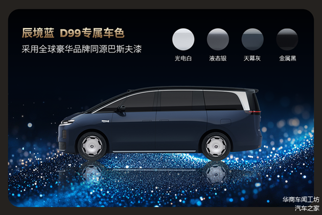 在色彩设计上,零跑D99坚持“自然共生”理念,雕琢出五款意境悠远的豪华外观色,赋予车辆独特的视觉灵魂。其中,“辰境蓝”为零跑D99的专属色,静止时呈现沉稳克制的绅士气质,驰骋在阳光下则会唤醒细腻珠光,折射出年轻灵动的气息。为呈现这种高级质感,零跑选用顶级豪华品牌同款的巴斯夫车漆,让颜色更通透、层次更丰富,且光泽持久不易失色。此外,光电白的纯粹冷峻、液态银的温暖优雅、天幕灰的深邃莫测与金属黑的低调不凡,五款自然灵感色分别对应不同的审美志趣,让每一台零跑D99都能成为用户个性与气质的延伸。