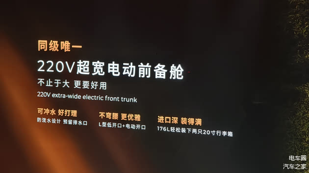 有六座版,也有七座版的D19,就像乐道L90一样,拥有一个大开口大容量的前备厢。可以电动开启的L型低开口前备厢,预留排水口、空间大,可玩性很高。