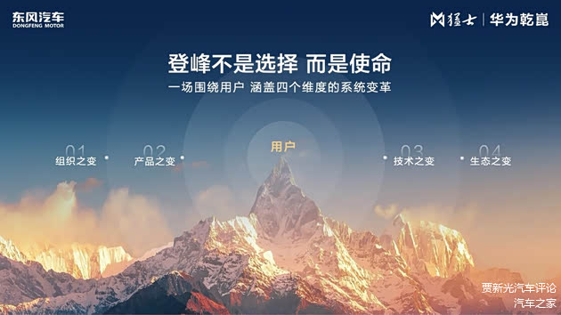 面对智能越野时代的到来,猛士汽车将以用户为原点,以“组织再造、产品进化、技术跃迁、生态重塑”四大变革,全力向下一个高峰攀登。