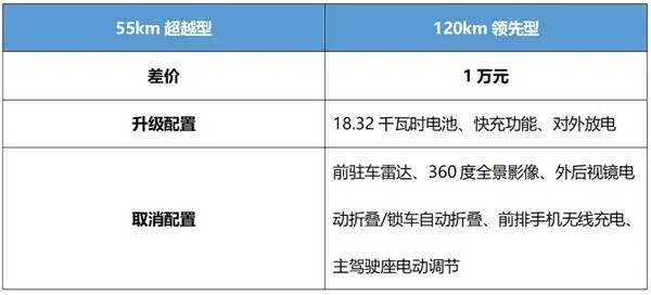 120km领先型的主要升级点在于电池容量提升至18.32千瓦时,纯电续航里程更长,并且具备快充以及对外放电功能。但与55km超越型相比,它取消了前驻车雷达、360度全景影像、外后视镜电动折叠/锁车自动折叠、前排手机无线充电、主驾驶座电动调节等配置,综合考虑其配置变化,该版本不太建议优先选择。