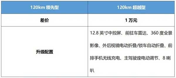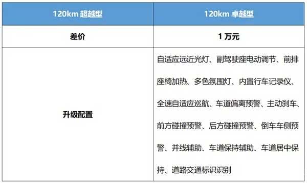 顶配的120km卓越型,在价格上比120km超越型多1万元,却能带来全方位的升级。它升级为L2级驾驶辅助系统,提供全速自适应巡航、车道偏离预警、主动刹车、前方碰撞预警、后方碰撞预警、倒车车侧预警、并线辅助、车道保持辅助、车道居中保持、道路交通标识识别等功能,为驾驶者带来更便捷、安全的驾驶体验。同时,还升级了自适应远近光灯、副驾驶座电动调节、前排座椅加热、多色氛围灯、内置行车记录仪等配置。可以说,这多花的1万元物超所值。而且,由于官方政策原因,该版本13.58万元的限时价,使其性价比进一步提升,所以是全系中最为推荐的版本。