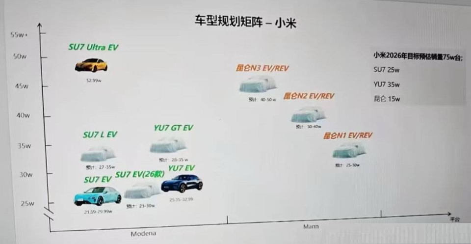 日前,网上曝光了小米汽车2026年的新车计划,至少将有4款新车推出,包括SU7改款、SU7行政版、一款增程五座SUV及一款增程七座SUV。 其中上半年将推出SU7改款和增程七座SUV,下半年推出SU7行政版(长轴距版)、增程五座SUV。其中,增程7座SUV内部代号“昆仑”,定位中大型家庭SUV,将搭载超过70度电的“大电池”增程方案,纯电续航可达400-500公里,对标理想L9、零跑D19等车型,