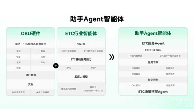 - 在智能核心层,「助手Agent」引入ETC行业规则与服务流程知识库,并基于腾讯混元大模型构建稳定可信的服务中枢,实现语义理解与任务调度的精准协同。