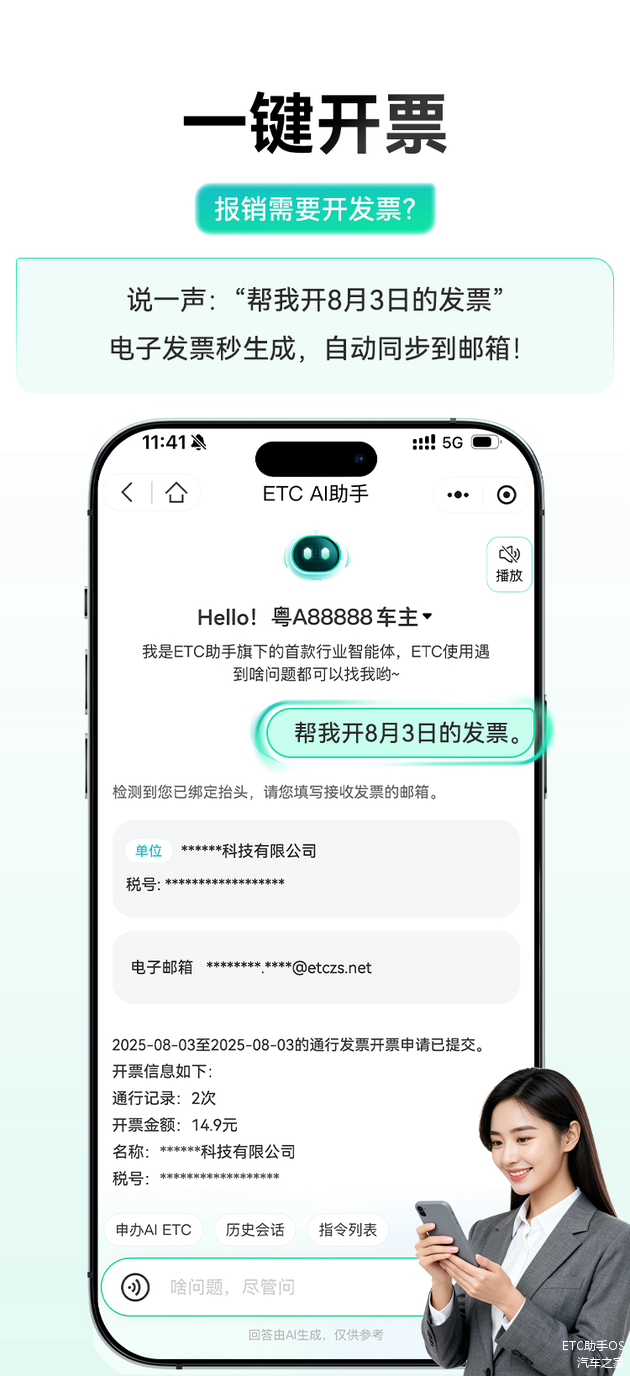 以前,查通行记录、开发票,得在小程序里层层点选。现在,只需一句:“帮我查上周的扣费详情”,或者直接喊一声“我要开票”,它就像你身边的真人助理,直接把结果推到你面前。