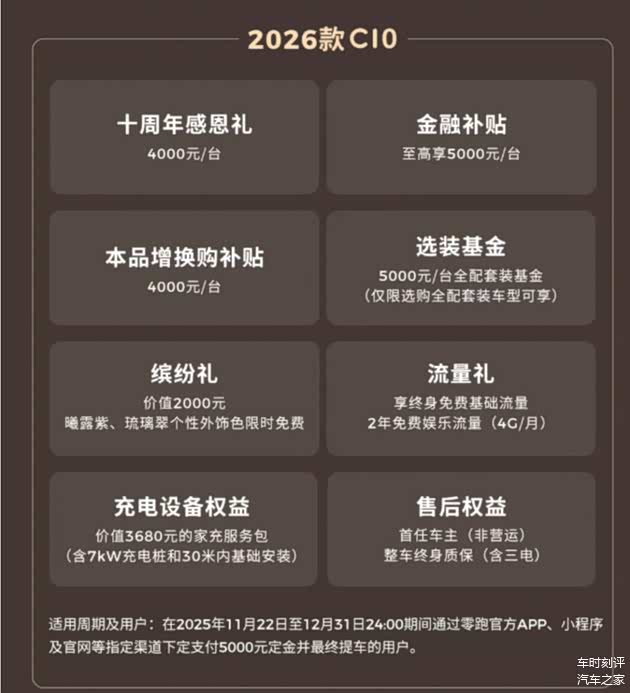 零跑C10 12月份限时促销政策加倍,直减4000元,金融补贴5000元,增换购补贴4000元等等,全系促销11.48万起,不仅有直降还送终身质保、免费送的家充设备,现在就是最好的入手时期;连续几个月销量破万,空间大、操控好、性价比高,零跑也连续8个月稳居新势力销量榜首,品牌有保障,C10现在优惠力度大趁促销可以抓紧下单。