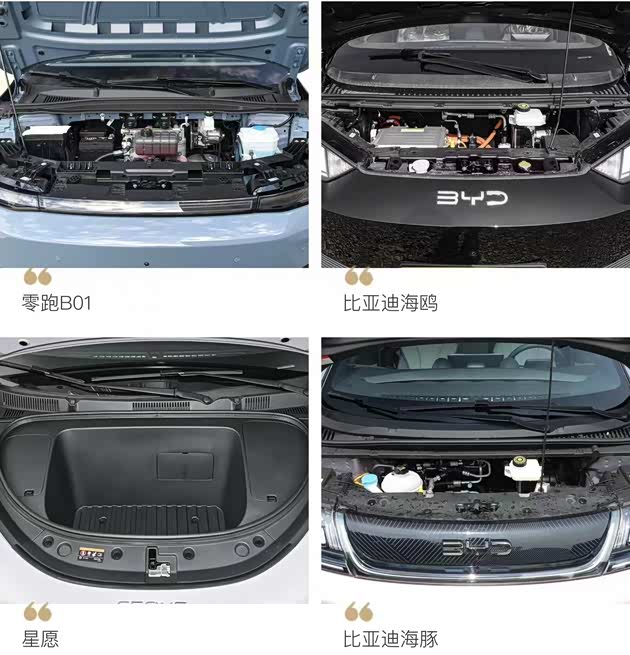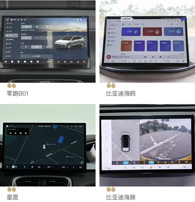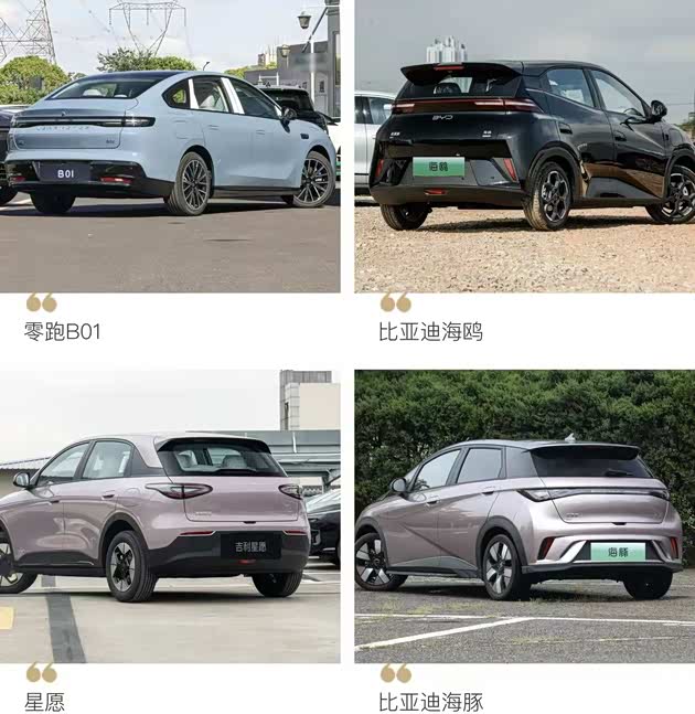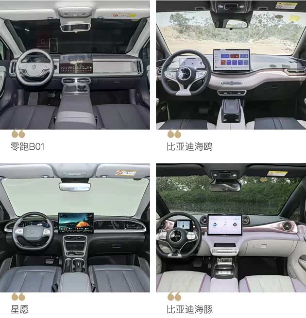 通过综合分析和横向对比,四台车各有千秋,比如说零跑B01外观是轿跑溜背设计偏向于年轻科技路线。而比亚迪海豚和海鸥融入了海洋元素动态感明显,星愿采用简约设计,显得干练。