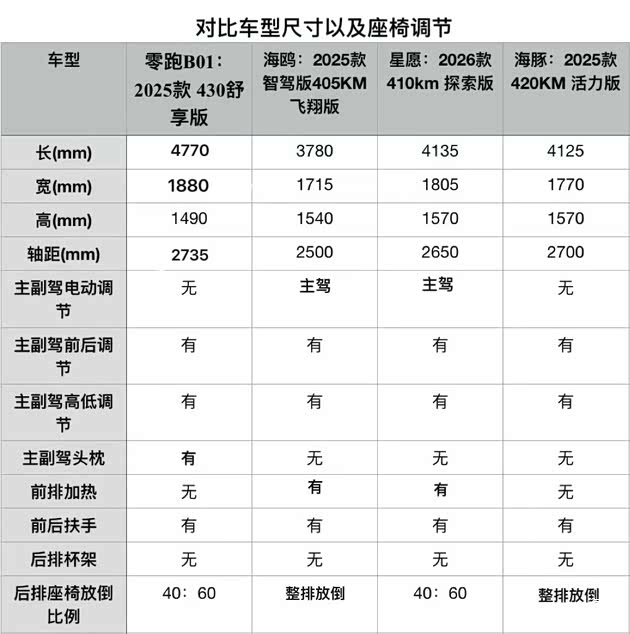 在座椅调节方面,四台车主驾驶都支持电动调节,其中海鸥和星愿多了副驾驶电动调节,不过零跑B01还多了主副驾头枕功能,零跑B01和星愿后排支持40:60比例放倒,相比整体放倒设计,兼顾载物与乘坐需求,提升了实用性。比如说放置滑雪板、自行车等大件时,可仅放倒60%区域,未放倒的40%部分仍可坐人,我觉得从空间舒适性方面来看,零跑B01要突出一些,不过四台车各有千秋。