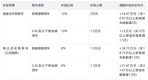 首先是关于汽车国补的问题,目前国家已经发布了相关的文件,需要关注的其实就两点:一是补贴方式变了,从固定金额补贴改成“按新车价比例补贴”,报废补贴,买新能源车补贴车价的12%(最高不超过2万元)、购买2.0升及以下排量燃油车补贴车价的10%(最高不超过1.5万元)。