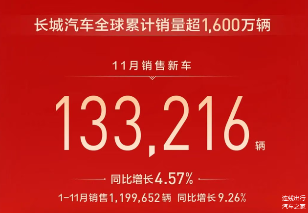 如今,长城汽车的销量增速较为缓慢。今年11月,长城汽车销售新车133216辆,同比增长4.57%;今年1月-11月,长城汽车已累计销售1199652辆,同比增长9.26%。